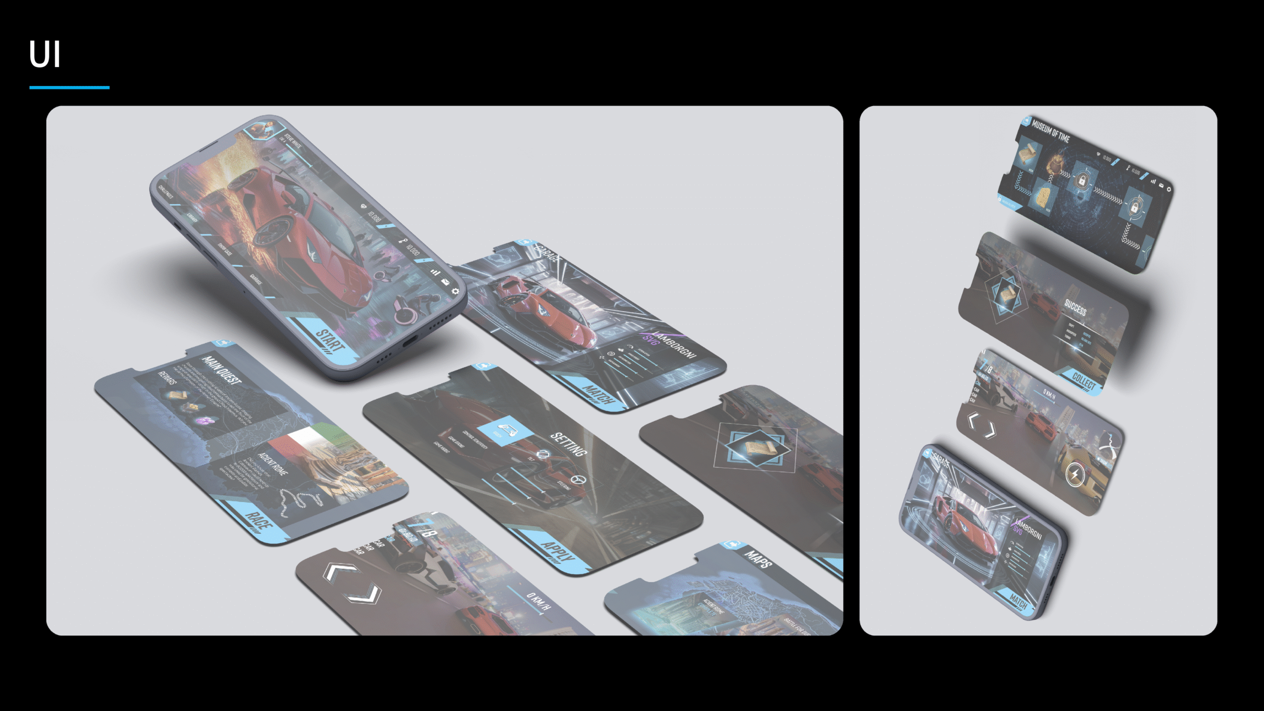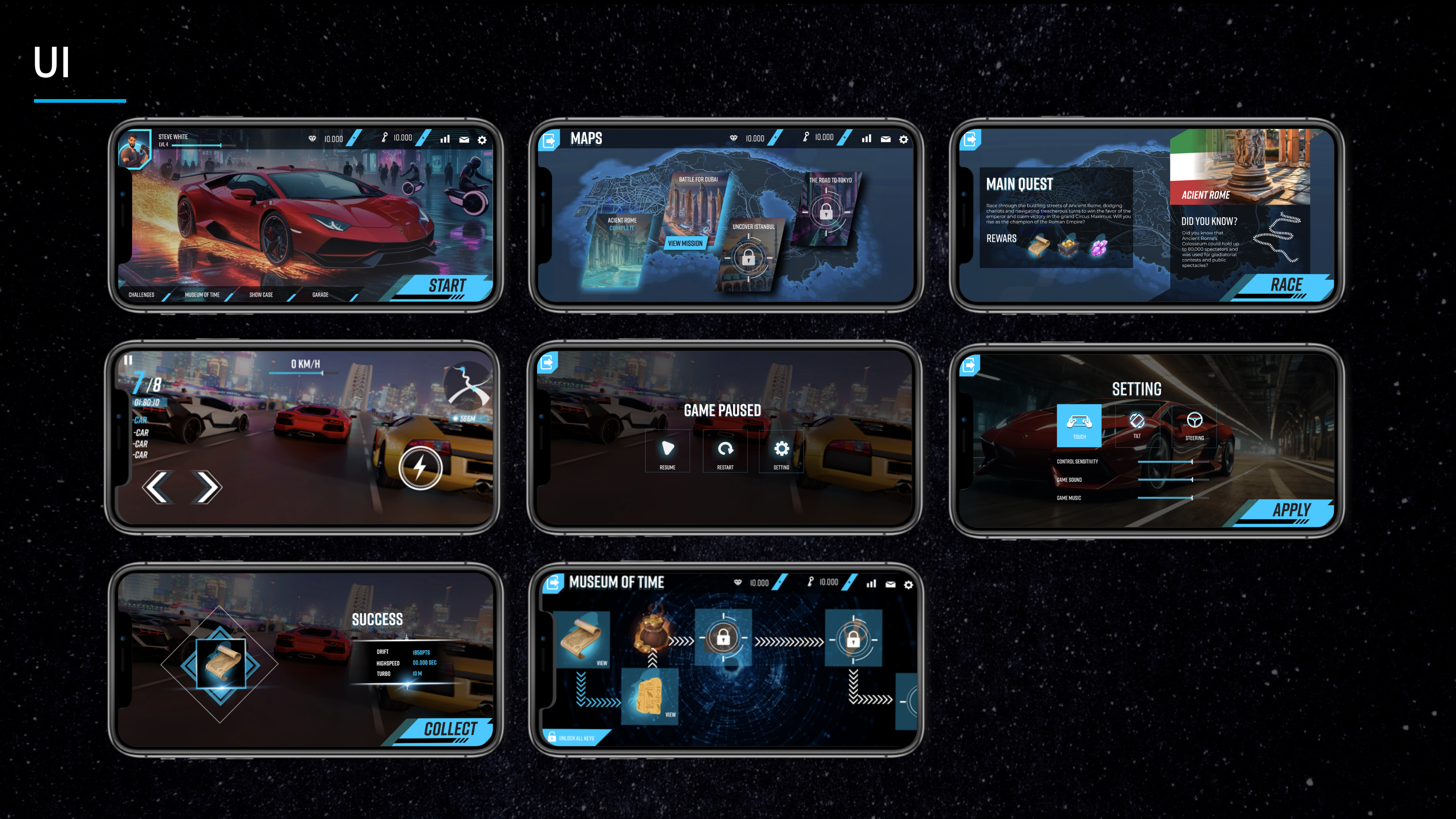 Pour Era Racers, un jeu mobile de course à travers le temps, j’ai conçu l’interface et l’identité visuelle du projet. Le concept plonge les joueurs dans différentes époques où ils doivent courir, explorer et collecter des clés pour restaurer l’équilibre du temps.